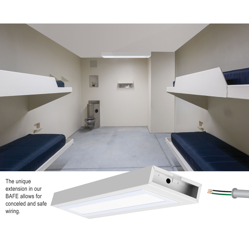 The BAFE combines maximum security construction features with energy saving technology. ETL listed for damp locations; optional wet location under covered ceiling. This surface mounted luminaire utilizes a one-piece housing, security lensing and tamper-resistant fasteners to maximize impact resistance and prevent contraband concealment and unauthorized fixture penetration. Die-formed body is available in various material options with a ligature resistant design. with extended mounted extension ring continuously seamed welded to the body and ground to form a one piece seamless housing. The BAFE is ideal for confinement/security applications. Suitable for use in inmate cells, psychiatric wards, secure corridors and general population areas.